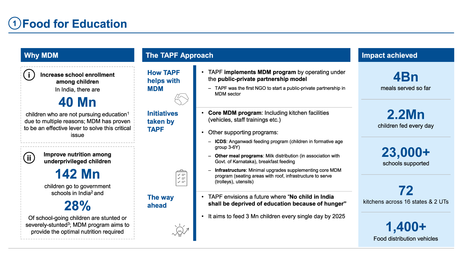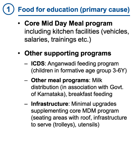 The Akshaya Patra Foundation is a not-for-profit organisation headquartered in Bengaluru, India. The Foundation strives to eliminate classroom hunger by implementing the PM POSHAN(Mid-Day Meal ) Programme. It provides nutritious meals to children studying in government schools and government-aided schools. Akshaya Patra also aims to counter malnutrition and support the Right to Education of children hailing from socio-economically challenging backgrounds.